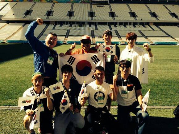 이는 한국시간으로 6월 27일 오전 5시에 열릴 브라질 월드컵 H조 3차전 경기인 '대한민국 vs 벨기에' 전 승리를 위해 강호동, 김흥국, 이규혁, 서지석, 민호, 윤두준, 조한선, 이정 등 '우리동네' FC 8인이 미리 아레나를 방문한 것.