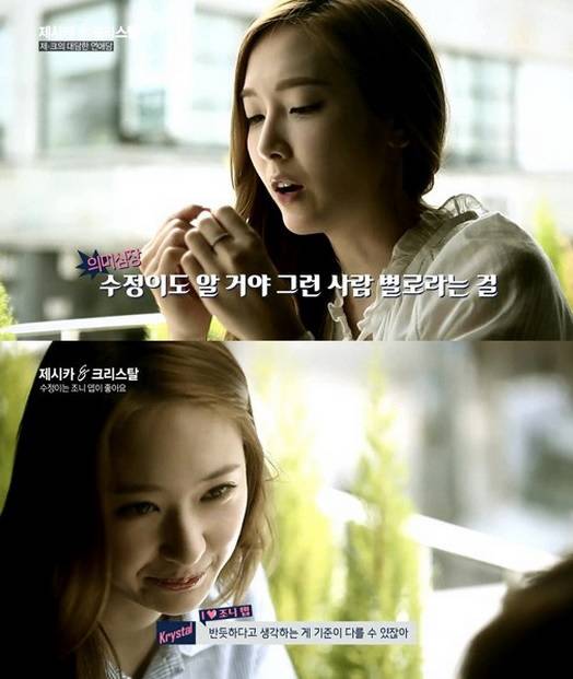 제시카 크리스탈 자매가 조니뎁을 두고 서로 다른 이성관을 드러냈다.제시카 크리스탈 자매는 지난 10일 방송된 온스타일 '제시카&크리스탈'에서 자신의 이상형과 결혼 등을 주제로 진솔한 대화를 나눴다.이날 크리스탈은 "배우 조니뎁을 좋아한다. 조니뎁이 과거 케이트 모스와 사귀었는데 난 그런 커플이 되고 싶다"며 "언니가 이런 얘기를 하면 항상 손을 훠이훠이 내젓는다"고 털어놨다.이에 제시카는 "그런 사람 별로라는 걸 수정이도 알거다. 반항기가 있어서 그렇다. 세상에 뭐가 그리 불만이 많냐. 반듯한 사람을 만나라. 누가봐도 반듯하지 않아 보이는 사람들한테 눈길이 많이 가는 것 같다"고 밝혀 크리스탈을 당황하게 만들었다.이어 크리스탈이 "반듯하다고 생각하는 게 기준이 다를 수 있잖아"라고 말하자 제시카는 "그런 사람을 만나면 나중에 너가 전혀 행복하지 않을 거다"고 진심어린 충고를 건넸다.[제시카 크리스탈, 사진=온스타일 '제시카&크리스탈' 방송 캡처]