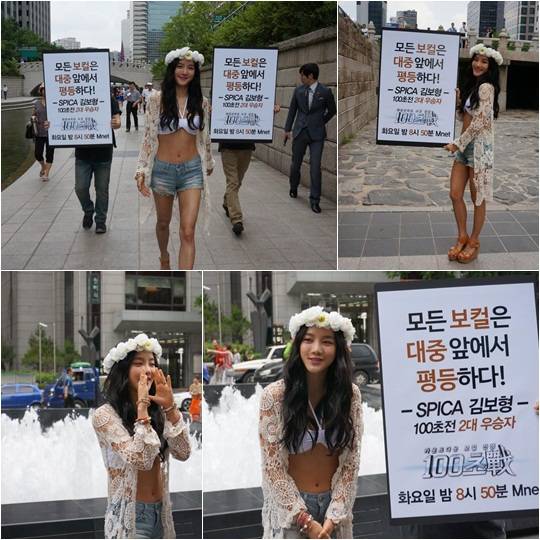 걸그룹 스피카 김보형이 비키니를 입고 우승공약을 실천했다.11일 Mnet 공식 트위터에는 "오늘 낮 12시 청계천 광장에서 진행된 '100초전' 2대 우승자 스피카 김보형의 당당한 비키니 공약 현장을 전합니다"라는 글과 함께 여러 장의 사진을 올렸다.공개된 사진 속 김보형은 머리에 화관을 쓴 채 청계천 광장을 비키니 차림으로 걷고 있다. 또한, '모든 보컬은 대중 앞에서 평등하다!'는 문구가 적힌 팻말을 들고 있으며, 그녀 주위에는 듬직한 보디가드까지 대동해 눈길을 끈다.앞서 김보형은 10일 방송된 Mnet '100초戰(전)' 2회에서 김완선의 '삐에로는 우릴 보고 웃지' 무대를 선보였다. 김보형은 얼굴이 공개되지 않는 초반 100초부터 시원시원하고 파워보컬을 앞세워 관객들의 귀를 사로잡았고, 이어 원형 돔이 오픈된 후 곡의 하이라이트에 다다르자 자신의 모든 것을 쏟아붓는 파워풀한 보컬을 선보이며 무대를 마무리했다.결국 김보형은 함께 출연한 고유진, 이은하, 박상민, 영지, 금잔디, 스컬 등 쟁쟁한 경쟁자들을 제치고 2회 우승자로 등극했다. 이에 따라 우승 공약으로 내세운 '비키니 입고 거리활보'를 직접 실천한 것이다.[김보형 비키니 공약실천, 사진=Mnet 공식 트위터]