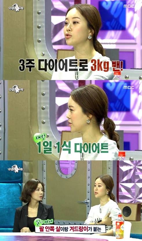 가수 백지영이 컴백 전 다이어트를 했음을 털어놨다.지난 11일 방송된 MBC '황금어장-라디오스타'에는 '곱게 늙은 언니들' 특집으로 발레리나 강수진, 배우 김성령, 가수 백지영이 출연해 솔직한 입담을 뽐냈다.이날 백지영은 "결혼 후 6kg이 급격하게 쪘다. 컴백 전 살을 빼려고 하니까 너무 안 빠졌다. 3주 동안 겨우 3kg을 뺐다"고 다이어트 고충을 토로했다.이에 함께 출연한 강수진과 김성령은 "어떻게 뺐냐?"고 관심을 보였다. 백지영은 "되게 힘들었다. 매일 운동하고 1일 1식 하면서 샐러드만 먹었다"고 밝혔다.이어 "이렇게 살이 쪄본 게 처음이다. 말랐을 때는 겨드랑이 통풍이 잘 됐는데 살이 찌니까 팔 안쪽 살이랑 겨드랑이가 붙어 답답하고 찜찜하더라"라고 말해 웃음을 자아냈다.[백지영 다이어트, 사진=MBC '라디오스타' 방송 캡처]