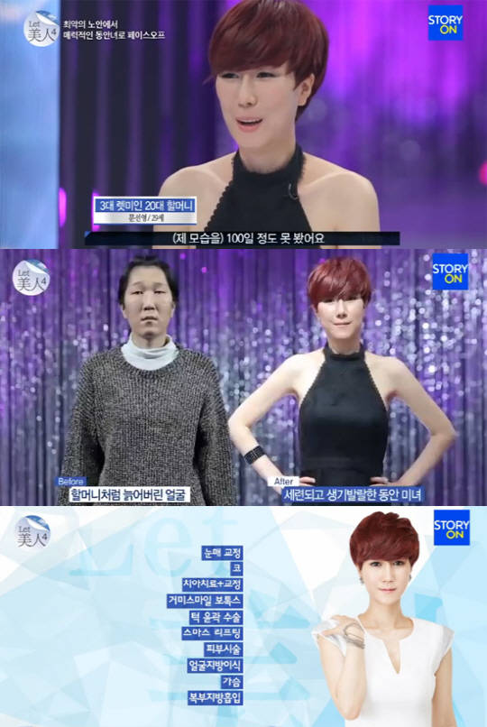 동안미녀로 거듭난 '렛미인' 20대 할머니의 수술비에 관심이 집중되고 있다.지난 12일 방송된 스토리온 '렛미인4' 3회 '노안' 편에서는 20대임에도 '할머니'라고 불릴 만큼 심각한 노안으로 고통 받던 문선영(29)이 3대 렛미인으로 선정돼 시청자들에게 뭉클한 감동을 선사했다.'20대 할머니' 문선영은 경제적으로 어려워 치아 치료를 놓친 탓에 쓸 수 있는 치아가 몇 개 없는 상태였다. 이날 '렛미인' 닥터스의 도움을 받아 20대 미모를 되찾은 문선영은 하얀 치아를 드러내고 활짝 웃을 수 있게 됐다.제작진에 따르면 문선영의 결정적 노안의 원인이었던 긴 턱은 V 라인 턱 끝 수술로 7mm 가량을 줄이고, 리프팅을 통해 탄력있는 얼굴을, 눈매교정술로 또렷한 눈매를 만들었다.또한, 오랜 노숙 생활로 인해 처진 듯한 가슴과 몸매에도 교정술과 흡입술을 감행했다. 총 수술비로만 무려 9477만 원이 들었다.방송을 본 시청자들은 "20대 할머니 사연에 너무 안타까워 눈물 흘리며 봤다", "문선영씨가 환한 웃음을 되찾아 정말 기뻐요", "외모뿐만 아니라 새로운 삶을 시작할 수 있도록 도와주는 렛미인 제작진에 감동했다", "20대 할머니는 이젠 안녕!" 등의 반응을 보였다.['렛미인' 20대 할머니, 사진=스토리온 '렛미인 4' 방송 캡처]