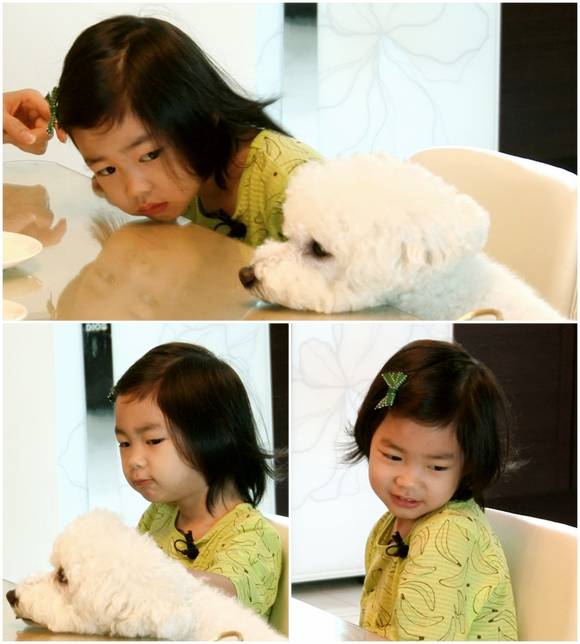 아침 식사를 위해 식탁에 모여 앉은 타블로의 가족들. 타블로를 비롯해 강혜정, 하루 사이를 떡 하니 갈라놓는 이가 등장했으니, 이는 다름 아닌 타블로-강혜정 부부가 하루를 낳기 전까지 키우던 애완견 '흰둥이'였다.