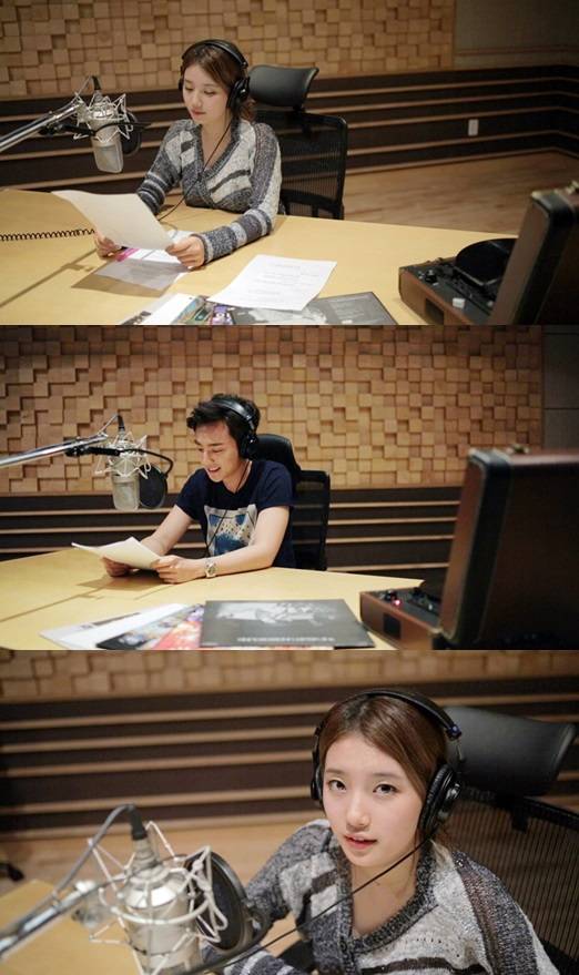 또한, 수지는 단정히 묶은 머리에 부드러운 회색 톤의 니트를 입고 대본에 열중하며 특유의 청순미를 자랑한다. 로이킴 역시 진지한 얼굴로 녹음에 임하며 훈훈함을 자아낸다.