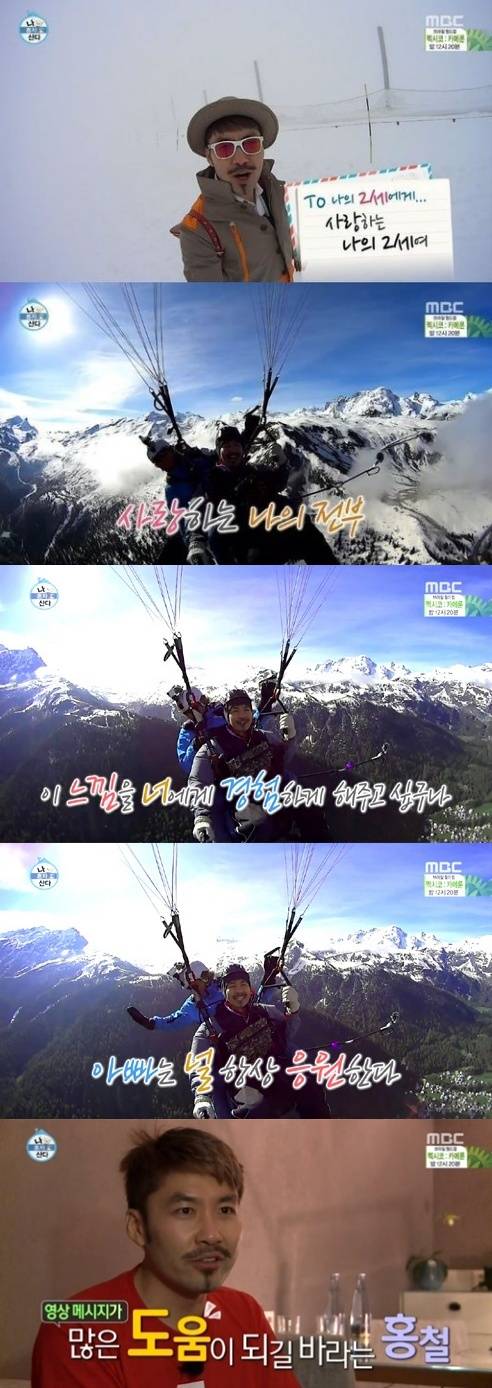 그럼에도 '노긍정' 노홍철은 패러글라이딩 도중 셀프 카메라로 2세에게 보내는 영상 편지를 촬영햇다. 그는 "사랑하는 나의 2세여 아빠는 지금 알프스 산맥에서 하늘을 날고 있다. 믿기지 않지?"라며 말문을 열었다.