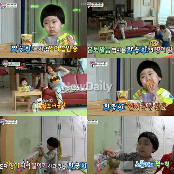 '슈퍼맨이 돌아왔다' 야꿍이 김지후가 영어 신동의 면모를 드러냈다.15일 방송된 KBS 2TV '해피선데이-슈퍼맨이 돌아왔다'에서는 다섯 가족들의 특별한 만남을 담은 '친해지길 바라' 편이 전파를 탔다.이날 배우 김정태의 아들 야꿍이(지후)는 아침식사를 하며 혼자 영어 단어를 줄줄이 따라했다. 특히, 본토 발음 뺨치는 영어발음에 아빠 김정태는 놀라움을 금치 못했다.또한, 야꿍이는 혼자 알파벳을 순서대로 배열하는 등 조금씩 성장하는 모습을 보여줘 보는 이들을 흐뭇하게 만들었다.'슈퍼맨이 돌아왔다' 야꿍이 영어실력을 접한 네티즌들은 "슈퍼맨이 돌아왔다 야꿍이 영어 정말 잘한다", "야꿍이 이젠 못본다니 너무 아쉬워", "슈퍼맨이 돌아왔다 야꿍이 영어실력 이 정도였어?", "슈퍼맨이 돌아왔다 야꿍이 영어신동이 여기 있었네" 등의 반응을 보였다.한편, 김정태 야꿍이 부자는 선거유세 논란으로 이날 방송을 끝으로 '슈퍼맨이 돌아왔다'에서 하차한다. 6.4 지방선거 전 자신의 아들 지후와 함께 새누리당 나동연 경남 양산 시장의 선거 유세 현장에 나섰다는 의혹을 받아 논란에 휩싸인 바 있다.[슈퍼맨이 돌아왔다 야꿍이, 사진=KBS2 '슈퍼맨이 돌아왔다' 방송 캡처]