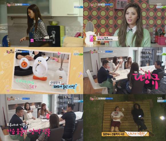 '룸메이트' 나나가 깜짝 선물로 웃음과 감동을 선사했다.지난 15일 방송된 SBS '일요일이 좋다–룸메이트'에서 나나는 일본 스케줄 중 멤버들을 위해 직접 구입하고 포장까지 한 깜짝 선물을 전달했다.이날 '룸메이트' 나나는 평소 요리를 잘하는 '신엄마' 신성우에게는 달걀요리 도구를, 송가연에게는 휴대용 운동기구를, 음주를 즐기는 애주가 홍수현에게는 깜찍한 음주측정기를 선물했다.또, 서강준을 '강레쉬맨'으로 변신하게 만든 '후레쉬맨' 의상까지 멤버들의 성격과 재미를 함께 고려한 선물들이었다. 특히, 이날은 멤버들이 알지 못했던 신성우의 생일이기도 해 그는 나나의 선물에 감동을 받았다.멤버들은 선물의 내용에 당황하기도 하고 박장대소 하는 등 나나의 특별한 선물에 고마워했다. 신성우와 조세호는 "너무 감동이다", "마냥 밝고 귀여운 줄 만 아는데 알고 보면 나나가 속이 깊다"면서 나나의 마음 씀씀이에 칭찬을 아끼지 않았다.이 외에도 '룸메이트' 나나는 직접 내레이션을 맡아 멤버들에 대한 애정을 유감없이 드러냈다. 또, 10분 거리를 4시간이나 걸리는 초보운전 실력을 선보여 시청자들에게 웃음을 안겼다.[룸메이트 나나, 사진=SBS '룸메이트' 방송 캡처]