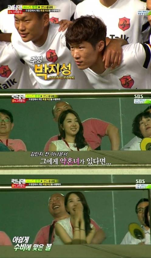 SBS 김민지 전 아나운서가 박지성의 경기를 응원하는 모습이 포착됐다.지난 15일 방송된 SBS '일요일이 좋다-런닝맨'에서는 꿈의 그라운드를 밟기 위해 인도네시아로 떠난 멤버들이 2014 드림컵에 출전해 브라질 월드컵의 열기를 후끈 달궜다.이날 드림컵 시작 전 JS프렌즈는 기념사진을 촬영했고, 이때 카메라는 경기장을 가득 채운 관중석을 비쳤다. 이때 관중석에는 박지성을 응원하기 위해 자리한 예비신부 김민지의 모습이 포착돼 눈길을 끌었다.김민지 전 아나운서는 환한 미소로 박지성의 경기를 지켜봤고, 박지성이 공을 골대에 맞히자 그 누구보다 안타까워했다.한편, 박지성 김민지 커플은 오는 7월 27일 서울 W호텔에서 결혼식을 올린다.[김민지 박지성 응원 포착, 사진=SBS '런닝맨' 방송 캡처]