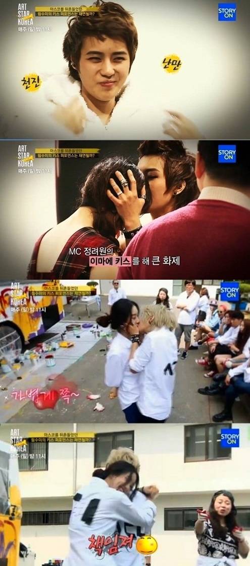 정려원의 입술을 훔친 림수미에 대한 관심이 집중되고 있다.지난 15일 방송된 온스타일 '아트스타 코리아' 11회 스페셜 편에서는 MC 정려원과 15명의 도전자들이 소외된 아동을 돕기 위한 재능기부 활동을 떠나는 비하인드 스토리가 전파를 탔다.앞서 도전자 림수미는 3회 '사회적 금기'라는 주제 미션에서 정려원에게 이마 키스 퍼포먼스로 화제를 모은 바 있다.이날 도전자들은 당시의 일을 언급하며 림수미에게 "이마 뽀뽀는 약했다. 지금이라면 입술에 할 수 있겠지?"라며 "입술에 했으면 안 떨어졌을 것"이라고 말했다. 이에 림수미는 정려원에게 깜짝 뽀뽀를 하는 과감한 행동으로 모두를 놀라게 했다.조소와 설치 미술 아티스트인 림수미는 보이시한 매력을 자랑하며, 현재 시카고 미술 대학원을 휴학 중이다. 그녀는 매 미션마다 자신만의 색깔을 담은 이색적인 작품과 퍼포먼스로 시청자들의 눈길을 끌었다.한편, '아트스타 코리아'는 예술가 15인이 미션에 따라 자신들의 작품 세계를 표현하는 국내 최초 아트 서바이벌 프로그램으로 우승자에겐 창작 지원금 1억원과 유명 아트 갤러리에서 개인전 개최, 해외 연수 등의 혜택이 주어진다.[정려원 림수미, 사진=스토리온 '아트 스타 코리아' 방송 캡처]