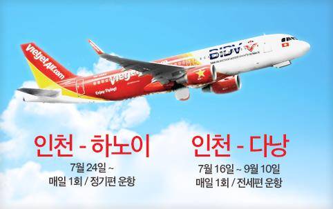 베트남 국적 저비용 항공사인 비엣젯 항공은 오는 7월 인천-다낭 및 인천-하노이 신규 취항기념으로 50% 할인 특가 타임세일을 실시한다고 16일 밝혔다.