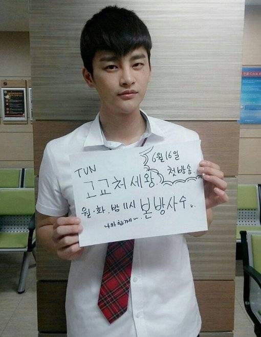 가수 겸 배우 서인국(26)이 '고교처세왕' 본방사수를 독려했다.16일 서인국의 공식 트위터에는 "D-Day! 교복 입은 민석이가 궁금하다면 오늘 밤 11시 서인국과 함께 tvN '고교처세왕' 첫방송을 본방사수 해주세요"라는 글과 함께 한 장의 사진을 올렸다.공개된 사진 속 서인국은 교복을 입고 '고교처세왕' 플래카드를 든 채 카메라를 응시하고 있다. 특히, 서인국의 귀여운 손글씨와 실제 고등학생 같은 훈훈한 비주얼이 눈길을 끈다.코믹 오피스 활극 '고교처세왕'은 18세 고교생 이민석이 형을 대신해 대기업 간부 행세를 하게 되면서 일어나는 아슬아슬한 이중생활을 그린다. 극중 서인국은 하루아침에 대기업 간부가 되는 고등학생 이민석과 그의 형 이형석을 동시에 연기한다.tvN 새 월화드라마 '고교처세왕'은 '마녀의 연애' 후속으로 16일 밤 11시에 첫방송된다.['고교처세왕' 서인국, 사진=젤리피쉬 엔터테인먼트]