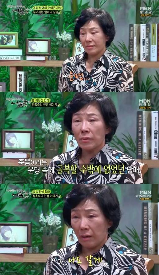 고(故) 최진실 어머니 정옥숙 씨가 아들 딸을 잃은 후 심한 우울증을 앓았다고 고백했다.지난 16일 방송된 MBN 힐링토크쇼 '어울림'에서는 故 최진실 최진영 남매의 어머니 정옥숙 씨가 출연해 허심탄회한 이야기를 털어놨다.이날 정옥숙 씨는 "최진실 최진영을 떠나 보내고 심한 우울증을 겪었다. 삶의 끈을 놓지 않고 어떻게 견뎌냈는지 지금 생각해도 아찔하다"며 "혼자 있으면 가슴 밑바닥에서 회오리바람을 쳐서 올라오는 외로움과 고독이 목구멍까지 꽉 차 올랐다"고 밝혔다.또한, "하루는 최진실이 남긴 물건 속에서 우울증 약을 발견했다. 그때 딸 아이의 고통을 진심으로 이해하게 됐다"며 "딸 아들 보내고 약이 없었다면 정신병자처럼 살았을 거다"고 당시의 심경을 전했다.정 씨는 "인생을 살면서 운명이라는 단어를 그때 절실히 느꼈다. 두 아이들을 잃고 나서 난 '아, 나도 갈게'라는 생각이 들었다. 그 이후로 호시탐탐 두 아이를 따라가려고 했다"며 고통스러웠던 지난날을 떠올렸다.이어 "내 자신이 무섭고 지독했다. 하지만 어린 아이들이 날 의지하고 할머니라고 부를 때 '내 앞에는 저 아이들이 있구나' 생각했다"고 말했다.[최진실 어머니 우울증 고백, 사진=MBN '어울림' 방송 캡처]