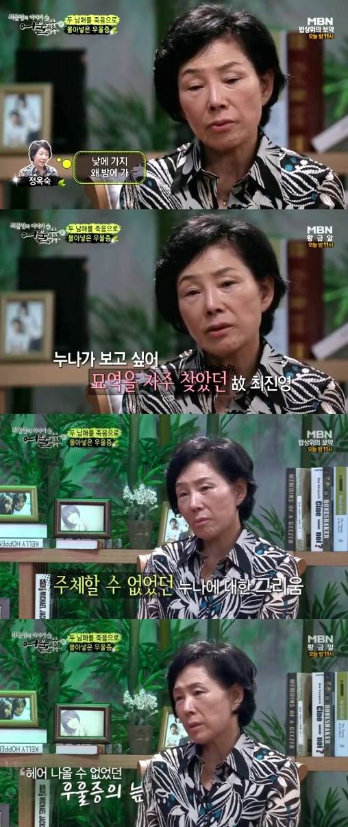 故 최진실 어머니 정옥숙 씨가 생전 누나에 대한 최진영의 각별한 애정을 털어놨다.지난 16일 방송된 MBN 힐링 토크쇼 '어울림'에서는 최진실 최진영 남매의 어머니 정옥숙 씨가 출연해 파란만장한 인생 이야기를 들려줬다.이날 최진실 어머니 정옥숙 씨는 "최진실이 세상을 떠난 후 15개월 만에 최진영도 떠났다. 누나가 떠나고 나니까 정말 마음 아파서 못 견뎌 했다. 최진영이 누나 있을 때 생각만 했고, 노트에도 누나 얘기만 써놨을 정도였다"고 말했다.이어 "진영이가 밤만 되면 없어졌다. 매일 1, 2시간씩 최진실의 묘역을 찾아서 얘기를 하다 왔다. 또 누나 물건을 자기 방에 전시를 해뒀다. 되게 걱정했었다"고 덧붙였다.또한, 최진실 어머니는 "진영이도 우울증에 걸려서 몇 번을 치료했다. 나 혼자 하다가 안 돼서 지인들에게 도움을 받아 괜찮다는 의사가 있으면 함께 가서 진료를 받았다. 몇 달 정도 괜찮더니 다시 우울증이 찾아왔다. 그렇게 아들이 떠났다"고 전하며 눈시울을 붉혔다.[최진실 어머니, 사진=MBN '힐링토크쇼 어울림' 방송 캡처]