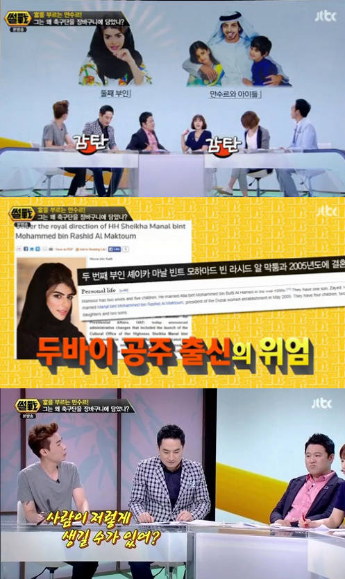 허지웅이 석유재벌 만수르 아내의 미모를 극찬했다.지난 19일 방송된 JTBC '썰전'에서는 브라질 월드컵 시즌을 맞이해 영국 '맨체스터 시티 FC' 구단주이자 아랍의 석유재벌 셰이크 만수르 빈 자예드 알 나얀에 대한 이야기를 나눴다.이날 MC 강용석은 "아랍국가가 일부다처제인데, 만수르의 둘째 부인이 어마어마하게 예쁘다"며 만수르의 둘째 부인의 미모를 언급했다.이어 화면에 만수르의 둘째 부인의 사진이 공개됐고, 이를 본 박지윤은 "그림이 아니라 실제 사진이냐. 어쩜 저렇게 예쁠 수가 있냐"며 놀라워했다.김희철 역시 '대박"이라고 감탄했고, 허지웅은 "사람이 저렇게 생길 수가 있어?"라고 말하며 입을 다물지 못했다.[만수르 둘째 부인 미모, 사진=JTBC '썰전' 방송 캡처]