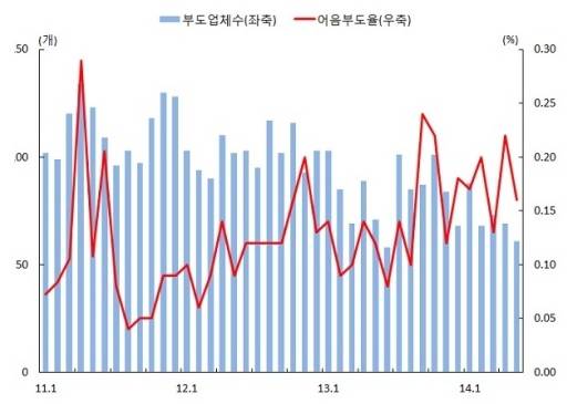 20일 한국은행이 발표한 ‘2014년 5월 중 어음부도율 동향’에 따르면 전국 어음부도율(전자 결제 조정전)은 0.16%로 전월 0.22%보다 0.06% 포인트 낮아졌다.
