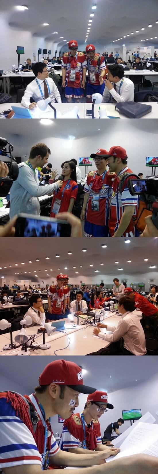 '무한도전' 유재석 노홍철이 월드컵 중계팀 김성주 안정환 송종국과 만났다.23일 MBC '무한도전' 측은 유재석과 노홍철이 브라질 포루트 알레그레에서 김성주 안정환 송종국을 만나는 모습을 공개했다.2014 브라질 월드컵 축구 대표팀을 응원하기 위해 브라질에 온 유재석 노홍철은 MBC 월드컵 중계방송에 직접 참여했다. 두 사람은 23일 펼쳐진 '대한민국 : 알제리' 경기 전 이재은 아나운서와 그라운드에서 현장의 열기와 감동을 전했다.미디어센터에 도착한 유재석 노홍철은 미리 리포트 내용을 챙겨보고 이재은 아나운서와 호흡을 맞춰 보는 등 꼼꼼히 준비 후 방송에 임했다. 중계 준비 중인 MBC 중계팀을 만나 서로에게 응원 메시지를 전하기도 했다.MBC '무한도전' 브라질 원정 응원기는 28일 오후 6시 15분에 방송된다.한편, 유재석 노홍철 중계 참여를 접한 네티즌들은 "유재석 노홍철 대한민국 알제리 경기 중계 이겼으면 좋았을걸", "유재석 노홍철 준비 많이 한듯", "대한민국 알제리 다들 아쉬운 경기", "유재석 노홍철 한국이 져서 마음 무겁겠네", "대한민국 알제리에 완패 16강 어쩌나" 등의 반응을 보였다.[유재석 노홍철, 사진=MBC]