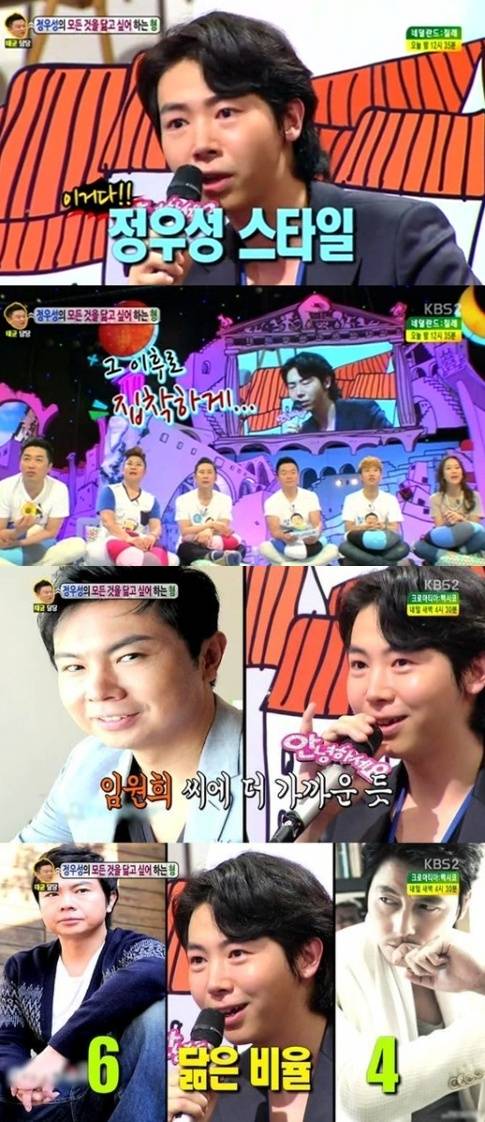 배우 정우성의 모든 것을 닮고 싶어 하는 남자가 '안녕하세요'에 등장했다.지난 23일 방송된 KBS2 TV '안녕하세요'에는 정우성을 닮고 싶어 하는 형 때문에 고민이라는 황대성 씨의 사연이 소개됐다.이날 사연의 주인공은 "친하게 지내는 형이 연예인에 빠져 산다. 여자 아이돌이 아닌 정우성에 완전히 꽂혔다"며 "정우성처럼 되고 싶어 머리를 기르고, 성형까지 했지만 정작 임원희를 닮았다"고 밝혔다.이에 정우성 닮은꼴이라고 주장하는 이 남성은 "2년 전 군대 동기에게 전화가 왔다. '내 머릿속에 지우개'를 봤는데 나보고 정우성 느낌 나는 거 같다고 하더라. 그때부터 정우성 스타일로 가야겠다고 생각했다"고 집착 이유를 설명했다.그는 정우성을 닮기 위해 1년간 잠적해서 살도 빼고 머리도 길었다. 심지어 눈썹 반영구 문신에 앞트임 수술까지 했다고 전해 놀라움을 자아냈다.정우성 닮은꼴을 접한 네티즌들은 "정우성 닮은꼴 전혀 안 닮았어", "누굴 닮은 게 뭐가 그리 중요하다고..자신을 더 사랑하세요", "정우성 닮은꼴 우기는 거 윤종신이랑 똑같네", "감히 정우성과 비교를..아무나 닮나", "정우성 닮은꼴보단 임원히 닮은꼴" 등의 반응을 보였다.[정우성 닮은꼴, 사진=KBS2 '안녕하세요' 방송 캡처]