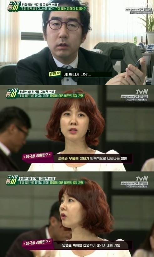 박소현이 비운의 천재 바이올리니스트 유진박이 양극성장애을 앓고 있다고 밝혔다.박소현은 25일 방송된 tvN '그 시절 톱10'은 전화위복한 스타 편에서 양극성 장애를 겪었던 유진박에 대해 언급해 이목을 집중시켰다.이날 박소현은 "유진박이 20대 초반부터 양극성 장애를 앓았다고 한다"며 "양극성장애는 조증과 우울증 상태가 반복적으로 나타나는 질환이다. 안정을 취한 상태에서만 의사소통이 가능하다"고 말했다.이에 소이는 "유진박은 정말 비운의 천재다. 8살 때 줄리어드 스쿨 음악학교에 입학했고, 6개 콩쿠르에서 다 우승했다. 김대중 대통령 취임식 때 공연했고 마이클 잭슨 공연에서도 연주했는데, 이런 사건을 겪게 돼 안타깝다"고 털어놨다.한편, 유진박은 예술인 장사익과 공연을 하는 등 재기를 위해 노력하는 것으로 알려졌다.[박소현 유진박 양극성장애 언급, 사진=tvN '그 시절 톱텐' 방송 캡처]
