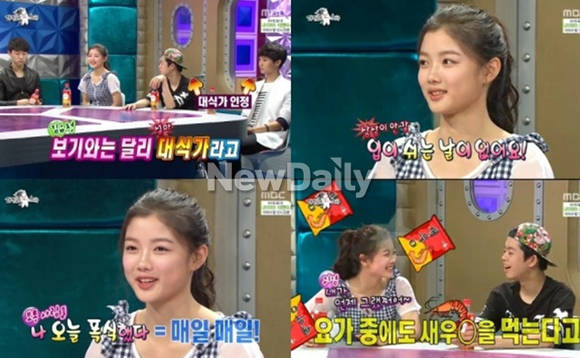 김유정이 대식가임을 밝혔다.지난 25일 방송된 MBC '황금어장-라디오스타'에는 '어른들은 몰라요' 특집으로 곽동연, 김유정, 노태엽, 김동현이 출연해 솔직한 입담을 뽐냈다.이날 김유정은 "가리는 음식이 없다. 흔히 다른 사람들은 '나 오늘 폭식했어'라고 말하는데, 거짓말이 아니라 나는 매일 매일 그렇게 먹는다"고 고백했다.이어 "배 불러도 계속 먹는다. 먹으면서 소화시키고 끊임 없이 반복한다"며 "입이 쉬는 날이 없다"고 털어놨다.또한, MC들이 "다이어트는 안 하냐?", "그렇게 먹는데도 살이 안 찌는 것 같다"고 말하자 김유정은 "많이 쪘다. (다이어트) 해야죠"라고 답했다.이를 옆에서 듣고 있던 김구라의 아들 김동현은 "김유정 요가 선생님과 내 요가 선생님이 같은데, 선생님께서 유정이는 요과 중에도 새우과자를 먹는다고 했다"고 폭로해 웃음을 자아냈다.[김유정 대식가 고백, 사진=MBC '라디오스타' 방송 캡처]