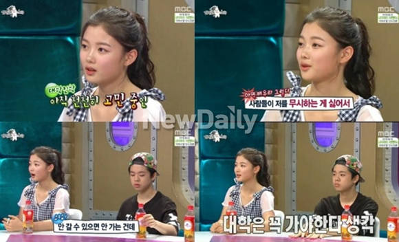 아역배우 김유정이 대학 진학에 대한 소신발언으로 어른스러운 면모를 드러냈다.지난 25일 방송된 MBC '황금어장-라디오스타'에는 '어른들은 몰라요' 특집으로 곽동연, 김유정, 노태엽, 김동현이 출연해 솔직한 입담을 뽐냈다.이날 김유정은 대학 입학에 대해 "대학은 계속 고민하고 있다"며 "안 갈 수 있으면 안 가는 건데 사람들이 나를 무시하는게 싫어서 가고 싶은 생각은 있다"고 밝혔다.이어 "인정 받으려고 공부하고 있다. 그래서 대학교는 꼭 가야한다고 생각한다. 인정 받아야 성공한 거다"고 답했다.[김유정 소신 발언, 사진=MBC '라디오스타' 방송 캡처]