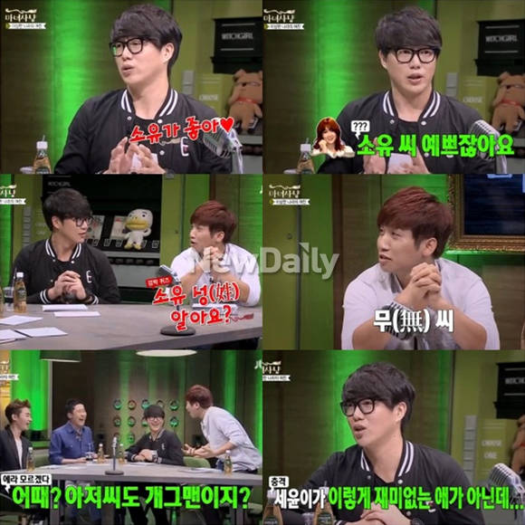 가수 성시경이 뜬금없이 씨스타 소유에 대한 사심을 고백했다.27일 방송된 JTBC '마녀사냥'에서는 자기 세계가 뚜렷한 연인 때문에 고민이라는 20대 남성의 사연이 공개됐다.이에 4MC 신동엽 성시경 허지웅 유세윤은 해당 사연에 대해 이야기를 나눴고, 성시경은 "연인끼리는 집착하는 재미다. 넌 내꺼, 난 네꺼. 이런 게 있어야 연애다. 여자 분은 그런 것이 너무 없어서 문제다"고 지적했다.허지웅 역시 "연인 사이에서 소유욕을 없애는 것은 불가능하다"고 덧붙였다. 이때 성시경은 갑자기 "소유가 좋다. 소유 예쁘잖아요"라고 진지하게 말했다.이어 유세윤은 "소유 성(姓) 아냐?"라고 물었고, 성시경이 모르겠다는 표정을 짓자 유세윤은 "무 씨"라고 밝혔다.유세윤의 허무개그에 순간 정적이 흐르며 신동엽, 성시경, 허지웅의 표정이 굳어졌다. 예상치 못한 반응에 유세윤은 "어때? 아저씨도 개그맨이지?"라고 분위기를 급 반전시켰다.이를 본 성시경은 "지금 약간 깜짝 놀랐다. 세윤이가 이렇게 재미없는 애가 아닌데..."라고 전해 웃음을 자아냈다.[성시경 소유 사심, 사진=JTBC '마녀사냥' 방송 캡처]