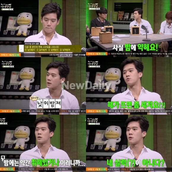 배우 하석진이 자신의 연애스타일을 솔직하게 고백했다.하석진은 지난 27일 방송된 종합편성채널 JTBC '마녀사냥'에 출연해 거침없는 입담을 선보였다.이날 하석진은 '낮져밤이, 낮져밤져, 낮이밤져, 낮이밤이' 중 어떤 연애스타일이냐는 '마녀사냥' 공식질문에 "사실 밤에 약하다"고 말했다.이어 "난 낮이밤져"라며 "해가 뜨면 좀 세진다. 밤에는 약간 취해 있으니까 내 실력이 아니다. 공정하지 않다"고 19금 발언으로 눈길을 끌었다.[마녀사냥 하석진, 사진=JTBC '마녀사냥' 방송 캡처]