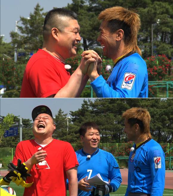이날 '골키퍼 특훈'을 자처한 이는 강호동의 '동갑내기 마산친구' 김병지. 아직은 서먹한 두 사람을 위해 정형돈이 내린 긴급 처방은 바로 '눈빛 교환'. 이에 강호동 김병지는 깍지손과 발 끝 터치, 밀착 호흡까지 감행했을 뿐 아니라 두 얼굴을 마주한 채 눈빛 교환을 시도하게 된다.