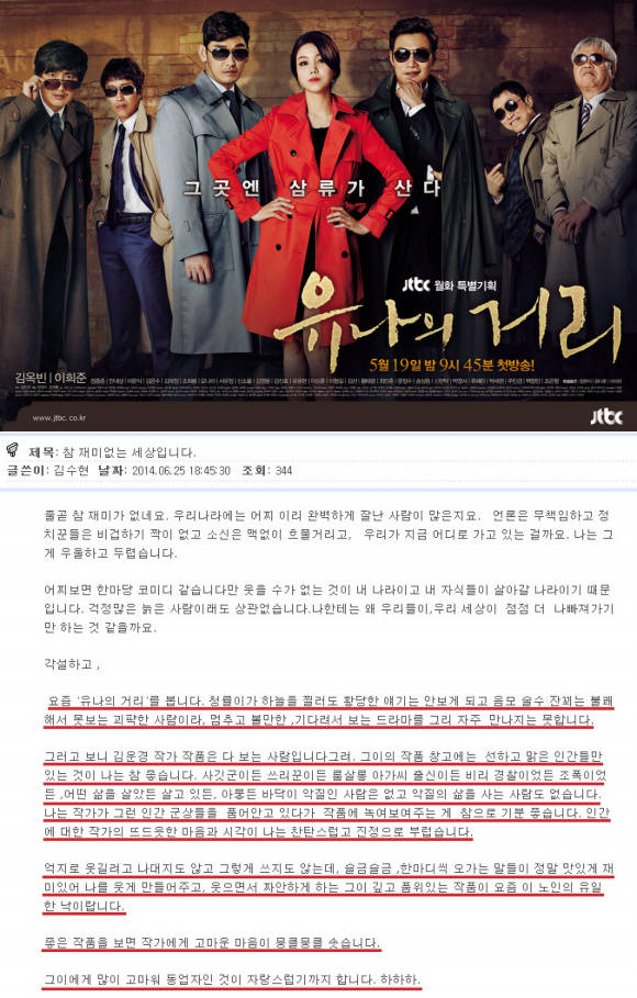 김수현 작가가 JTBC 드라마 '유나의 거리'를 극찬했다.