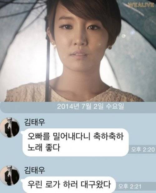 god 김태우가 윤하의 '우산' 음원차트 1위에 축하 메시지를 보냈다.윤하는 2일 자신의 트위터에 "태우오빠 축하문자. 밀어내다니 어딜 밀어내요. 제가 늦게 나와서 그래요. 멀리서도 축하해주셔서 너무 감격"이라는 글과 함께 캡처 사진을 게재했다.공개된 사진 속에는 윤하와 김태우가 주고 받은 모바일 메신저 대화 내용이 담겨 있다. 김태우는 윤하에게 "오빠를 밀어내다니 축하축하 노래 좋다"라고 전했다.앞서 god는 온라인을 통해 정규 8집 '하늘색약속'을 선공개했으며, 공개 1시간 만에 각종 음원차트 1위를 휩쓸었다. 하지만 이날 정오에 공개된 윤하 '우산'이 god를 제치고 1위를 기록하고 있는 것.한편, 윤하 '우산'은 비 오는 날 듣고픈 노래 1위이자 세월이 갈수록 더 큰 사랑을 받고 있는 에픽하이의 명곡으로, 올해 데뷔 10주년을 맞이한 윤하를 위해 원곡자 타블로가 직접 선물했다.윤하 '우산'은 투명하고 감미로운 음색에 슬픈 멜로디와 동화 같은 가사가 추가돼 어른이 되어가며 겪는 아픔들을 '비 오는 날'에 비유하고 있어 원곡과 또 다른 울림을 지닌 메시지를 담고 있다.[김태우 윤하 우산 1위 축하, 사진=위얼라이브, 윤하 트위터]