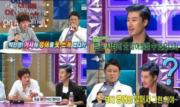 산이가 전 소속사 JYP의 박진영에 대한 불만을 토로했다.지난 2일 방송된 MBC '황금어장-라디오스타'(이하 '라디오스타')에는 '털털한 남자들' 특집으로 배우 한정수 임대호, 가수 박상민, 래퍼 산이가 출연해 솔직한 입담을 뽐냈다.이날 산이는 "박진영이 가사에 영어를 못 쓰게 했다는데 맞느냐"라는 MC 규현의 질문에 "솔직히 조금 불만이긴 했다"고 털어놨다.이어 "박진영이 듣는 사람은 못 알아들을 수가 있으니까 한국말로 쓰라고 하셨다"며 "어떤 단어들은 영어로 하는 게 더 멋있고 괜찮았을 텐데 아쉬움이 남는다"고 덧붙였다.이에 MC 김구라는 "자기보다 영어를 잘해서 그런 거다"며 박진영과 산이 사이를 이간질(?)을 했고, 산이는 "진영이 형이 영어는 더 잘한다. 똑똑해서 하버드에서 강연도 했다"고 설명했다.'라디오스타' 산이 방송을 접한 네티즌들은 "라디오스타 산이 착하네", "산이 볼수록 매력남", "라디오스타 산이 방송 보고 팬 됐어요", "산이 이젠 영어랩 실컷 할 수 있어 좋겠네", "라디오스타 산이 완전 호감이야" 등의 반응을 보였다.[라디오스타 산이, 사진=MBC '라디오스타' 방송 캡처]