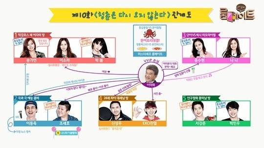 '룸메이트' 인물관계도가 공개됐다.SBS '일요일이 좋다-룸메이트' 제작진은 공식 홈페이지를 통해 6일 방송을 통해 그려질 10회 인물관계도를 게재했다.공개된 '룸메이트' 인물관계도에서는 초특급 VVIP 손님 이덕화의 사진이 등장해 궁금증을 자아낸다. 이덕화의 연결고리에는 MBC 드라마 '호텔킹'에 함께 출연중인 이동욱에게 "제이든~"이라 부르며 돈독한 애정을 내비쳤다.또, 과거 함께 진행한 경험이 있던 이소라에게는 "여보~"라고 불러 녹슬지 않은 예능감으로 시작부터 대활약을 예고했다. 맏형 신성우에게는 "결혼 언제 할래?"라며 거침없는 돌직구를 던졌다고 전해져 막강한 재미가 기대되는 상황이다.한편, '룸메이트'에서는 지난 주 조세호 부모님이 직접 싸오신 대왕 피문어로 자존심을 건 즉석 요리 대결을 펼쳤다. 특히, 팀을 나누는 과정에서 '홍길동과 두 알바'와 '문어발이 되고 싶어요'라는 웃음을 유발하는 독특한 팀명으로 기대감이 증폭되고 있다.SBS '룸메이트'는 6일 오후 4시 10분 방송된다.[룸메이트 인물관계도, 사진=SBS]
