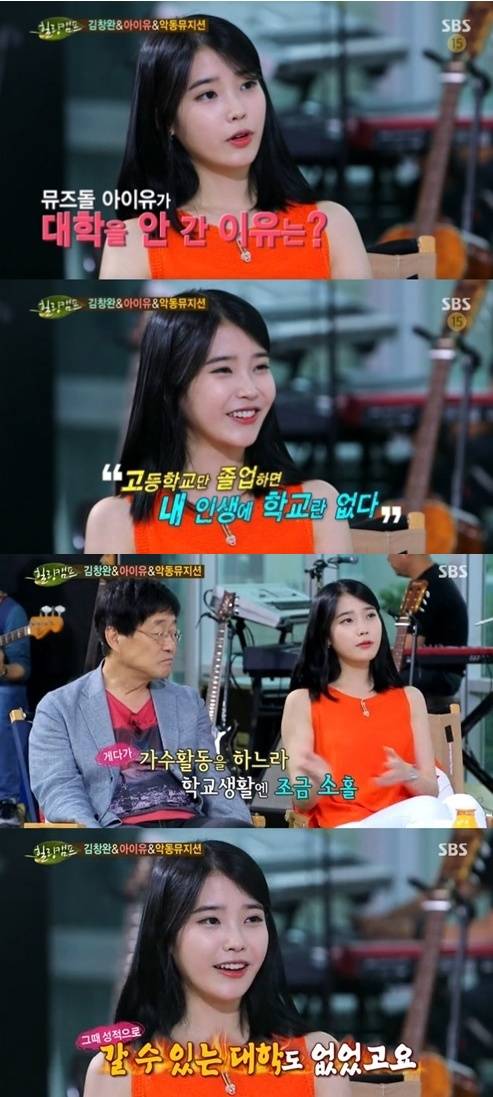 가수 아이유가 대학진학을 포기한 이유를 공개했다.지난 7일 방송된 SBS '힐링캠프'에서는 가수 김창완, 아이유, 악동뮤지션이 출연해 음악과 이야기가 어우러진 '힐링뮤직캠프' 특집으로 꾸며졌다.이날 김창완은 17세에 서울대학교에 입학한 사연을 털어놨고, 이에 MC 김제동은 아이유에게 "고 3때 수능을 안 친 걸로 안다. 그 나이 또래 사람들이 누리는 학창생활이 부럽지는 않았냐"고 물었다.이에 아이유는 "내가 학교를 별로 안 좋아했는지 고등학교만 졸업하면 학교와는 끝이라고 생각해서 고등학교 3학년만 바라보며 살았다"며 "당시에는 가수 활동을 하고 있어서 학교 생활을 열심히 하는 편도 되지 못했다"고 밝혔다.이어 "김창완 선배님은 서울대학교 들어가기가 굉장히 쉽다고 하셨는데, 나는 그때 성적으로는 진학할 수 있는 대학도 없었다. 그냥 과감히 포기를 했다"고 솔직하게 말했다.아이유 대학포기 이유를 접한 네티즌들은 "힐링캠프 아이유 입담 여전해", "아이유 대학포기 그런 이유가 있었구나", "힐링캠프 아이유 대학에 대한 편견을 깨줬다", "아이유 대학포기 이유 솔직하네", "힐링캠프 아이유 다음주 이야기가 더 기대돼" 등의 반응을 보였다.['힐링캠프' 아이유 대학포기, 사진=SBS '힐링캠프' 방송 캡처]