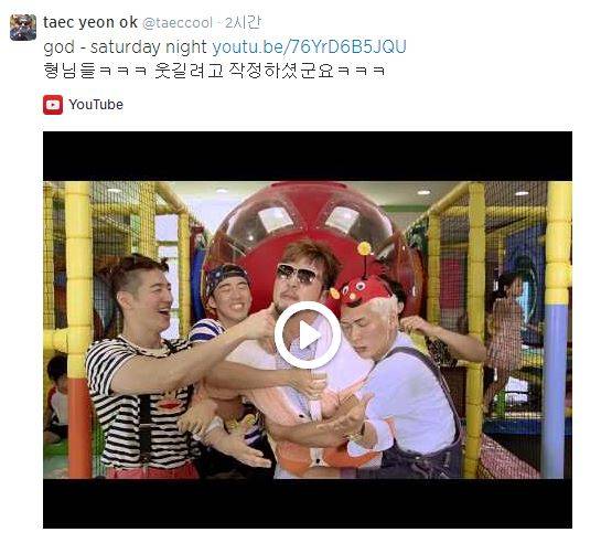 2PM 택연이 god 'Saturday Night' 뮤직비디오를 본 소감을 남겼다.택연은 8일 자신의 트위터에 "형님들, 웃기려고 작정하셨군요"라는 글을 게재하며 god 'Saturday Night' 뮤직비디오를 링크했다.god는 이날 8일 낮 12시 공식 유튜브 채널과 각종 음악 사이트를 통해 정규 8집 'Chapter 8'의 타이틀곡 'Saturday Night'(새터데이 나이트) 뮤직비디오를 공개했다.멤버들은 각자 카센터 직원, 회사원, 캬바레 DJ, 길거리 복서, 아이 아빠로 분해 god 특유의 능청스러운 코믹한 표정연기로 웃음을 자아낸다.god 'Saturday Night'은 가요계 최고 히트메이커인 이단옆차기의 작품으로 3집 수록곡 'Friday Night'의 2014년 Upgrade 느낌을 준다.한편, god는 7월 12일과 13일 양일간 잠실 종합운동장 보조경기장에서 15주년 기념 콘서트를 개최한다.[택연 god 'Saturday Night' 뮤비 언급, 사진=택연 트위터 캡처]