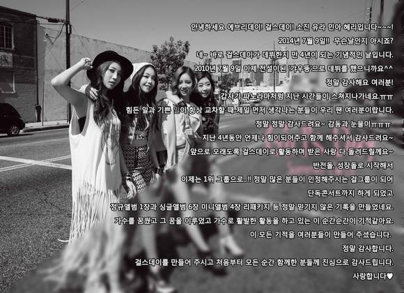 걸그룹 걸스데이(소진 유라 민아 혜리)가 데뷔 4주년을 맞아 팬들에게 감사인사를 전했다.9일 걸스데이는 공식 트위터를 통해 "지난 4년 동안 언제나 힘이 되어주고 함께 해주셔서 감사드려요~ 앞으로 오래도록 걸스데이로 활동하며 받은 사랑 다 돌려드릴께요~"라고 팬들을 향한 편지를 썼다.걸스데이는 지난 2010년 7월 9일 '갸우뚱'으로 데뷔해 '반짝반짝', '너, 한눈 팔지마', '한번만 안아줘', '오 마이 갓!', '나를 잊지마요', '기대해', '말해줘요', '여자대통령', '썸씽' 등 많은 히트곡을 탄생시켰으며 오는 13일 데뷔 4주년 기념 첫 단독콘서트 '썸머 타임' 공연을 앞두고 있다.걸스데이는 인사에서 "정말 많은 분들이 인정해주시는 걸그룹이 되어 단독콘서트까지 하게 되었고 정규앨범 1장과 싱글앨범 6장 미니앨범 4장 리패키지 등 정말 믿기지 않은 기록을 만들었네요"며 "가수를 꿈꿨고 그 꿈을 이뤘고 가수로 활발한 활동을 하고 있는 이 순간순간이 기적 같아요"고 팬들에게 고마움을 드러냈다.한편, 걸스데이는 이날 낮 12시 썸머스페셜 미니앨범 '썸머파티' 뮤직비디오 티저를 공개했으며, 오는 14일 앨범을 발표한다.[걸스데이, 사진=드림엔터테인먼트]
