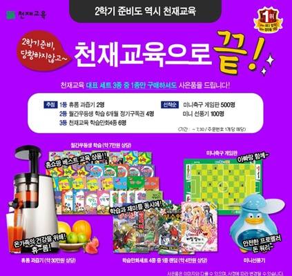7월 30일 1차 마감하는 이벤트에서는 교재 세트 구입 고객 중 추첨을 통해 1등 휴롬 과즙기(2명), 2등 월간우등생학습 6개월 정기구독권, 3등 천재교육 학습만화 4종(6명)과 그 외 선착순 고객을 대상으로 미니축구 게임판과 미니 선풍기를 증정한다.