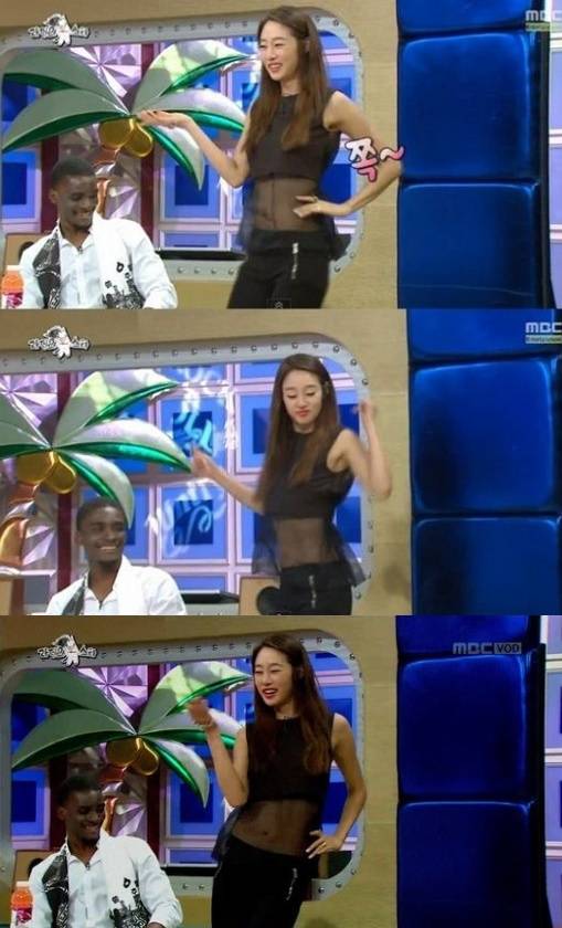 최여진이 화끈한 클럽댄스로 남심을 유혹했다.지난 9일 방송된 MBC '황금어장-라디오스타'에는 바다생물 닮은꼴 특집으로 최여진, 이상봉 디자이너, 프로듀서 방시혁, 방송인 샘 오취리가 게스트로 출연해 솔직한 입담을 뽐냈다.이날 최여진은 틴틴파이브 광팬이었다는 사실을 언급하며 "로봇 춤까지 따라 췄다. 초등학교 때 함께 춤 추는 멤버가 있었다"고 밝혔다.이에 MC들은 "정식으로 볼 수 있겠냐"고 부탁했고, 최여진은 망설임 없이 자리에서 일어나 로봇춤을 선보여 웃음을 자아냈다.또한, 최여진은 클럽댄스 요청에도 거절하지 않고 무대 앞으로 나갔다. 그녀는 허리가 그대로 보이는 블랙 시스루 의상을 뽐내며 예사롭지 않은 몸놀림과 섹시미로 좌중을 휘어잡았다.[라디오스타 최여진, 사진=MBC '라디오스타' 방송 캡처]