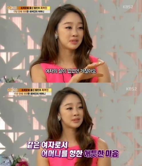 배우 최여진이 엄마에게 고마움을 드러내며 눈물을 흘렸다.10일 오전 방송된 KBS 2TV '여유만만'에는 슈퍼모델 출신 배우 최여진과 17년 만에 귀국한 그녀의 어머니 정현숙 씨가 출연해 허심탄회한 이야기를 나눴다.이날 최여진은 "엄마가 혼자 됐을 때가 30세 쯤이었는데 지금 내 나이보다 어릴 때다"며 "이혼해 자식들의 엄마로만 살며 고생을 많이 하셨다"고 고백하며 울먹였다.이어 "여자로서 화려하고 즐거운 시간을 보내는 나와 달리 엄마는 여자가 아닌 두 아이의 엄마를 선택했다. 나는 그렇게 못할 것 같다. 정말 감사하다. 이제 내가 지켜주고 싶다"며 애틋한 마음을 전했다.이에 최여진 엄마 정현숙 씨는 "나는 정말 행복해서 눈물이 안 난다"며 딸을 위로해 훈훈함을 자아냈다.[최여진 엄마 사진=KBS2 '여유만만' 방송 캡처]