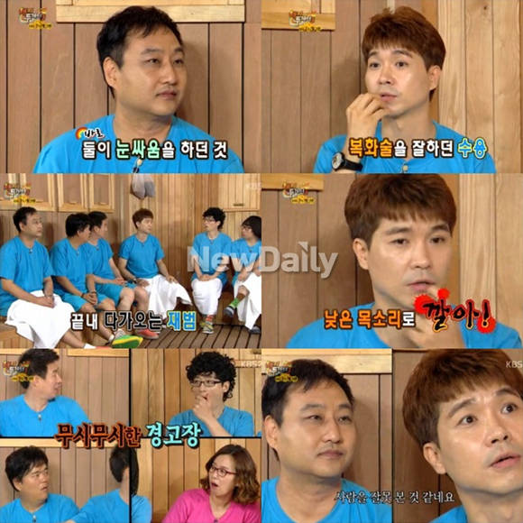 박수홍이 과거 김수용과 임재범의 충격적인 '여의도 전설' 비화를 공개했다.지난 10일 방송된 KBS 2TV '해피투게더3'에는 일명 '황금 라인'이라 불리는 KBS 7기 개그맨 박수홍, 남희석, 최승경, 김수용이 출연해 거침없는 입담을 뽐냈다.이날 박수홍은 여의도 한 카페에서 가수 임재범과 개그맨 김수용이 싸울 뻔한 에피소드를 털어놨다.박수홍은 "신인시절 김수용이 덩치도 좋고 나름 여의도 터줏대감이었다. 여의도에 앉아있으면 사람들이 쉽게 건들지 못했다. 그러던 어느날 김수용이 한 곳을 응시하는 것을 봤는데 거기 임재범이 있었다"고 당시를 회상했다.이어 "둘이 눈싸움을 했다. 김수용이 복화술을 잘 하는데 '오늘 관 짜라'라고 중얼거렸다. 갑자기 임재범이 우리 쪽으로 걸어오는데 너무 무서웠다"고 덧붙였다.그러면서 박수홍은 "임재범이 딱 오더니 낮은 목소리로 '눈 깔아'라고 하더라. 그 말을 듣고 김수용이 기 죽지 않고 맞붙었다. 그러자 임재범이 피던 담배를 본인 팔에 지졌다"고 말해 모두를 놀라게 했다.박수홍은 "옆에서 숨이 멎을 뻔 했다. 김수용도 그걸 보더니 '사람을 잘못 본 것 같다. 죄송했다. 제가 여의도 출신이거든요. 비슷한 분이 계셔서..'라고 변명을 했다"고 밝혀 웃음을 자아냈다.[김수용 임재범 싸움 비화, 사진=KBS2 '해피투게더' 방송 캡처]