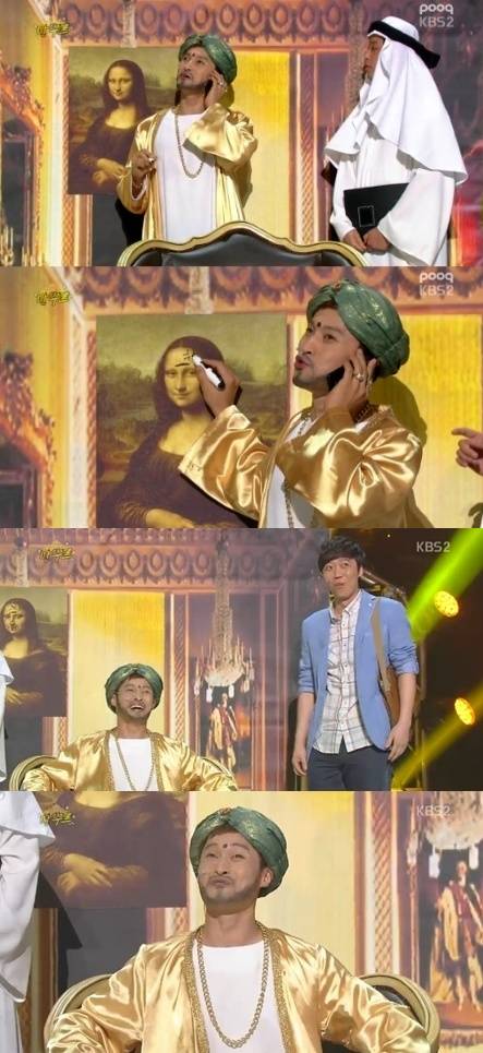 개그맨 송준근이 세계적인 갑부 만수르로 분해 허세 개그로 큰 웃음을 선사했다.지난 13일 방송된 KBS 2TV '개그콘서트'의 새 코너 '만수르'에는 송준근, 김기열, 홍원, 정해철, 김민경, 오나미가 출연해 만수르의 부를 패러디했다.이날 석유재벌 만수르로 분한 송중근은 비서 홍원이 모나리자 그림을 1500억원에 샀다고 하자 "중고라 싸게 샀냐"고 말해 웃음을 유발했다.이어 자신의 집을 찾아오는 친구에게 "직진 하다보면 안방 사거리가 나올 것이다. 부엌 톨게이트로 찾아나오면 돼"라고 길을 설명하며 모나리자 그림에 낙서를 했다.또한, 송준근의 아들이 "생일파티 사회자가 짐캐리가 뭐냐. 개그맨 김준현으로 해달라"고 떼를 쓰자 송준근은 "네가 거지야? 어디 생일파티에 각설이를 부르냐. 가서 금 들고 서있어"라고 화를 냈다.이 외에도 송준근 가정교사 김기열이 수업료로 1년에 8천만원 정도 번다는 이야기를 듣고 "자원봉사하냐. 재능기부 하시는 분이구나"라고 말하는가 하면, 큰딸 오나미가 애교를 부릴 때마다 백화점과 클럽을 선물해 폭소를 자아냈다.[개콘 만수르 패러디, 사진=KBS '개그콘서트-만수르' 방송 캡처]