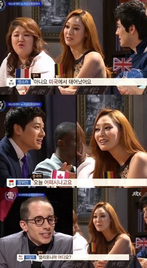 '비정상회담' 정소라가 능통한 3개 외국어를 뽐냈다.지난 14일 방송된 JTBC '비정상회담'에서는 첫 여성게스트로 개그우먼 이국주와 2010년 미스코리아 진 정소라가 출연해 '혼전 동거'에 대해 솔직한 입담을 펼쳤다.이날 정소라는 고려대학교 일어일문학과 출신이라는 소개와 함께 일본어, 중국어, 영어 등 유창한 3개 외국어를 구사해 눈길을 끌었다.정소라는 "미국에서 태어나고 중국에서 7년을 살았다"며 중국의 장위안, 미국의 타일러와 가벼운 대화를 나누며 엄친딸임을 입증했다.한편, '비정상회담'은 전현무, 유세윤, 성시경 3명의 MC와 각국 비정상 대표들인 11명의 외국인 패널이 출연해 한국 청춘들이 봉착한 현실적 문제를 토론하는 형식의 새로운 글로벌 토크쇼. 매주 월요일 밤 11시 방송된다.[비정상회담 정소라, 사진=JTBC '비정상회담' 방송 캡처]