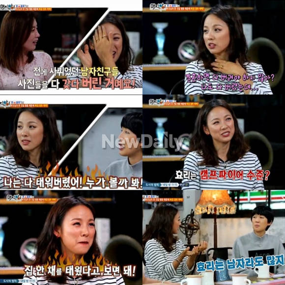 '매직아이' 이효리가 결혼 전 전 남자친구와의 사진을 다 불태웠다고 고백했다.지난 15일 방송된 SBS '매직아이'에서 3MC 이효리 문소리 홍진경과 게스트 박건형 봉태규는 '부모님의 못 견딜 행동 때문에 짜증 난 적이 있는가'를 주제로 이야기를 나눴다.이날 홍진경은 "남편과 결혼 날짜를 잡기도 전에 우리 엄마가 내 예전 남자친구와 찍은 사진을 전부 버려서 화가 났다. 소중한 추억을 숨겨도 내가 숨기고 싶었다"고 말했다홍진경의 말을 들은 이효리는 "결혼하면 어차피 버려야 하는 것 아니냐. 나는 누가 볼까봐 다 태워버렸다"고 솔직하게 밝혔다.이에 봉태규가 "캠프파이어 수준 아니었냐"고 말하자 이효리는 "집 한 채를 태웠다고 보면 된다"고 너스레를 떨어 웃음을 자아냈다.['매직아이' 이효리, 사진=SBS '매직아이' 방송 캡처]
