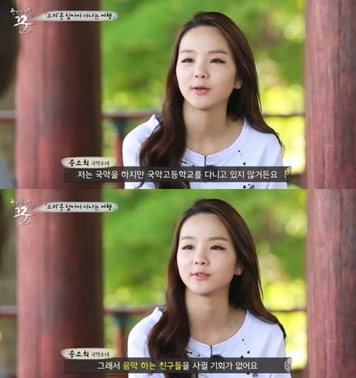 '국악스캔들 꾼' 송소희가 출연한 소감을 전했다박칼린과 송소희는 지난 15일 첫 방송된 tvN '국악스캔들 꾼'에서 국악인재를 만나 새로운 꿈을 키우고 신선한 자극을 얻는 모습이 공개됐다.국악신동에서 아름다운 국악소녀로 거듭난 송소희는 음악에 대한 이야기를 나누던 중 "국악을 하지만, 국악고등학교를 다니지 않아서 음악을 하는 친구를 사귈 기회가 많이 없었다"고 털어놨다.이어 "이렇게 국악인재들이 자신의 꿈을 위해 밤낮없이 연습하는 모습을 보고 나도 더 열심히 해야겠다는 자극을 받았다"고 전했다.한편, '국악스캔들 꾼'은 대한민국 1호 뮤지컬 음악감독 박칼린이 국악명인과 함께 '국악과 새로운 문화의 어울림'을 꿈꾸며 국악인재를 찾아 떠나는 소리여행 프로그램. 늘 새로운 것을 꿈꾸는 최고의 음악감독이자, 연출가인 박칼린과 전국 곳곳에 숨어있는 재능과 끼를 지닌 '꾼'들의 만남이 신명 나게 그려질 예정이다.[국악스캔들 꾼 송소희, 사진=tvN '국악스캔들 꾼' 방송 캡처]