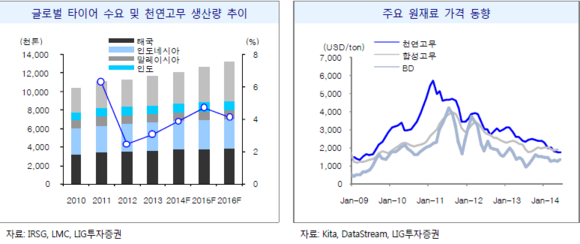 LIG투자증권은 "고무가격 상승 시기가 타이어 주가 반등의 본격화 시기"라며 "이르면 올 하반기, 늦으면 내년 무렵 고무가격이 오를 것"이라고 내다봤다.