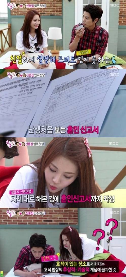 '우리결혼했어요' 홍종현 유라 커플이 혼인신고서를 작성했다.지난 19일 방송된 MBC '우리 결혼했어요4'에서는 홍종현 유라가 신혼집 입주와 함께 혼인신고서를 작성하는 모습이 그려졌다.이날 홍종현 유라는 혼인신고서 서류를 받아와 본적부터 꼼꼼히 적어내려갔다. 홍종현은 "우리 부모님도 프라이버시가 있다"며 부모님 성함을 이니셜로 작성하는 엉뚱한 면모를 드러냈다.유라 역시 아버지 성함을 KBC라는 이니셜로 적었고, 이를 본 홍종현은 얼떨결에 유라 아버지의 성함이 김병철임을 맞춰 놀라게 했다.어렵게 혼인신고서를 작성한 두 사람은 "결혼식을 올리고 혼인신고서를 쓰면 진짜 부부가 되는 거다"면서 "집에 붙여놓고 싶다"고 전했다.방송을 접한 네티즌들은 "우리결혼했어요 홍종현 유라 귀여워", "홍종현 매력에 푹~", "우리결혼했어요 홍종현 유라 볼수록 잘 어울려", "두 사람 완전 리얼해", "우리결혼했어요 홍종현 유라 혼인신고서 작성 케미 폭발" 등의 반응을 보였다.['우리결혼했어요' 홍종현 유라, 사진=MBC '우리 결혼했어요' 방송 캡처]