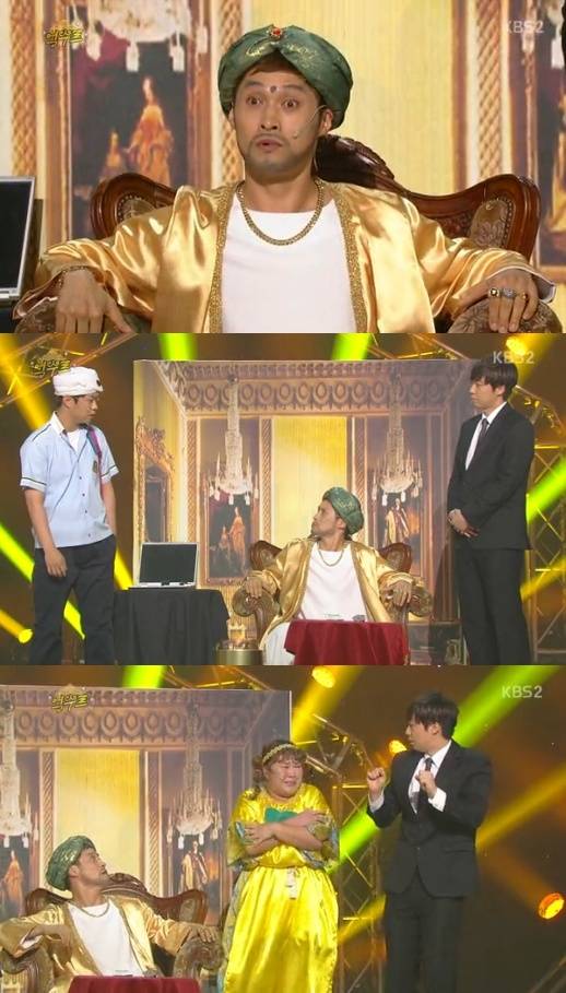 '개그콘서트'가 새 코너 '만수르' 제목을 '억수르'로 변경했다.지난 20일 방송된 KBS 2TV '개그콘서트'에서는 코너 '만수르'가' 억수르'로 바뀐 사실을 고지해 눈길을 끌었다.지난 13일 첫 선을 보인 '만수르'는 세계 재벌 0순위 셰이크 만수르 빈 자예드 알 나얀의 부를 패러디한 코너로 많은 화제를 모았다.하지만 방송 이후 한국석유공사 측은 실제 인물인 만수르의 이름을 따온 것이 자칫 외교적 결례가 될 우려가 있어 지난 16일 KBS에 코너명 변경을 정식으로 요청했다. 석유공사로서는 국제석유투자회사(IPIC)의 사장이자 아랍에미리트 부총리인 만수르의 눈치를 살필 수밖에 없다.'개그콘서트' 억수르를 접한 네티즌들은 "개그콘서트 억수르도 친근하다", "만수르 심기 불편할 수도..", "개그콘서트 억수르 제목 마음에 든다", "어쨌든 만수르 부러운 사람", "개그콘서트 억수르 이름만 들어도 대박!" 등의 반응을 보였다.[개그콘서트 억수르, 사진=KBS2 '개그콘서트' 방송 캡처]