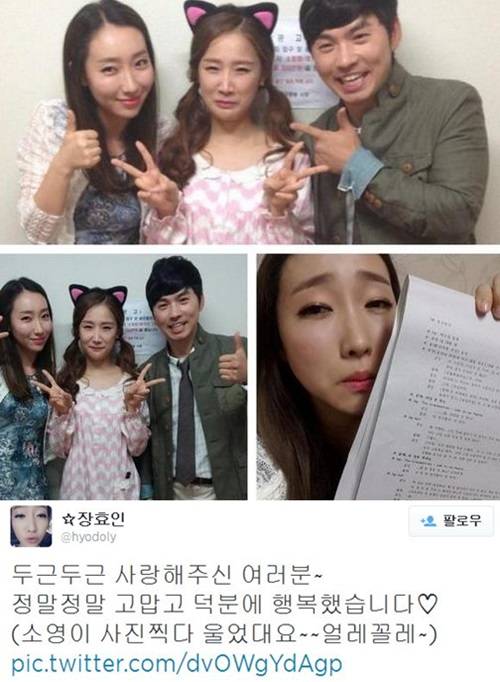 개그우먼 장효인이 KBS2 '개그콘서트'의 인기코너 '두근두근' 종영 소감을 전했다.장효인은 20일 자신의 트위터에 "두근두근 사랑해주신 여러분. 정말 정말 고맙고 덕분에 행복했습니다♡(소영이 사진 찍다 울었대요~ 얼레꼴레)"라는 글과 함께 사진들을 올렸다'공개된 사진 속에는 '두근두근' 코너에 함께 출연한 장효인, 이문재, 박소영이 나란히 서서 다정한 포즈를 취하고 있다.지난 20일 방송된 '두근두근' 마지막회에서는 오래된 친구 사이인 장효인과 이문재가 서로에 대한 진심을 고백하며 커플로 발전, 해피엔딩으로 막을 내렸다.한편, 지난해 6월 16일 첫 방송된 '두근두근'은 사랑과 우정 사이에서 서로에 대한 마음을 감추면서도 무의식적으로 속내를 드러내며 시청자들을 설레게 했던 코너. 이날 방송을 끝으로 폐지됐다.[장효인 '두근두근' 종영소감, 사진=장효인 트위터]