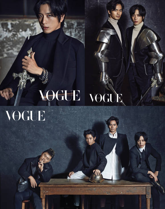 사극 분장을 하고 나오는 드라마와 달리 네 남자들은 검은 수트를 입고 갑옷과 투구, 칼 등의 소품을 활용하여 현대적인 느낌과 중세 기사의 이미지가 공존하는 독특한 화보를 완성했다.