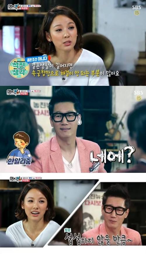 '매직아이' 이효리가 지석진에게 돌직구를 던졌다.지난 22일 방송된 SBS '매직아이'에서는 지석진, 박정철, 이정진이 게스트로 출연해 '살아보니 꼭 필요한 결혼 조건'을 주제로 솔직한 입담을 뽐냈다.이날 이효리는 속궁합에 대해 이야기 하던 중 지석진에게 "요즘에도 잠자리는 자주 하냐?"라고 물어 지석진을 당황하게 만들었다.이효리는 "주변에에서 이야기 들어 보니까 결혼생활 10년 지나면 안 하는 부부도 많다고 하더라"고 말했다.이에 지석진은 "섭섭하지 않을 만큼.. 신경 써야죠"라고 재치있게 답해 웃음을 자아냈다. 이어 지석진은 "물론 속궁합이 중요하지만 그것 만으로 사는 것은 동물적인 이야기 같다"고 덧붙였다.매직아이 이효리 돌직구를 접한 네티즌들은 "매직아이 이효리 입담 거침없네", "지석진 얼굴 붉어진 것 좀 봐", "매직아이 이효리 유부녀 돼서 더 화끈해진 듯", "지석진 많이 당황하셨어요?", "이효리 돌직구에 지석진 쩔절.. 정말 웃기다" 등의 반응을 보였다.[매직아이 이효리, 사진=SBS '매직이아' 방송 캡처]