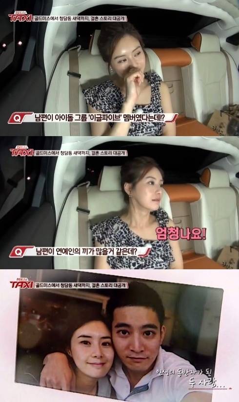 배우 최정윤 남편이 과거 이글파이브 멤버였던 사실이 밝혀졌다.최정윤은 지난 22일 방송된 tvN '현장토크쇼 택시'에 출연해 남편과의 첫 만남부터 결혼에 이르기까지의 달달한 러브스토리와 함께 '재벌가 며느리'에 대한 오해와 진실을 털어놨다.최정윤은 지난 2011년 12월 4살 연하의 이랜드그룹 박성경 부회장 장남인 윤태준과 결혼했다. 최정윤 남편은 2PM 닉쿤을 닮은 이목구비로 훈훈한 외모를 자랑한다.이날 최정윤은 "남편이 아이돌 그룹 이글파이브 멤버였다"며 "끼가 엄청나다. 지금도 남편은 '난 너무 배우가 하고 싶어'라고 말한다. 죽기 전에 한 번이라도 하고 싶다고 하는데 나는 반대다"고 말했다.최정윤 남편이 활동한 이글파이브는 지난 1998년 데뷔한 5인조 보이그룹으로 '오징어 외계인'으로 많은 사랑을 받았으나 2집 발표 후 해체했다.[최정윤 남편, 사진=tvN '택시' 방송 캡처]