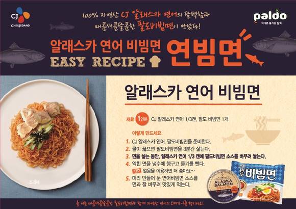 CJ제일제당과 팔도가 올 여름을 강타할 색다른 레시피를 선보이며 소비자 공략에 나섰다. '알래스카 연어'와 '팔도비빔면'으로 만든 '알래스카 연어 비빔면(일명 연빔면)'이 바로 그것.CJ제일제당과 팔도는 국내 수산물 통조림의 차세대 주자로 급부상한 '알래스카 연어'와 '골빔면(골뱅이+팔도비빔면)', '참빔면(참치+팔도비빔면)' 등 다양한 레시피를 자랑하며 대표 장수 비빔면으로 자리매김한 '팔도비빔면'을 앞세워 콜라보레이션 마케팅을 펼치기 시작했다.팔도는 지난해 동원F&B와 함께 '골빔면' '참빔면' 등의 공동 레시피 마케팅을 추진한데 이어 올해는 CJ제일제당과 '연빔면'으로 무더위에 지친 소비자 입맛을 사로잡겠다는 전략이다. 나만의 특별한 방식으로 서로 다른 제품을 섞어 쓰거나 새로운 방법으로 즐기는 '모디슈머' 열풍이 지속되고 있어 큰 인기가 예상된다.팔도와 CJ제일제당은 연빔면 레시피를 널리 알리기 위해 대형마트를 중심으로 한 시식행사와 알래스카 연어와 팔도 비빔면의 연관진열을 통해 제품 구매 시 할인해 주는 판촉행사도 진행할 계획이다.또한 팔도 비빔면 5개입 제품 패키지에 '연빔면' 레시피 디자인을 입히고, 소비자들이 집에서 쉽고 간편하게 '연빔면'을 즐길 수 있도록 레시피 카드를 제공하여 노출 극대화에 주력할 예정이다.특히 팔도는 CJ제일제당 백설의 '건강을 생각한 고소한 참기름'과도 공동 이벤트를 진행해 고소한 참기름과 매콤한 비빔면의 간편한 레시피로 여름철 소비자의 입맛을 공략할 계획이다.CJ제일제당 알래스카 연어 담당 신효은 브랜드 매니저는 "집에서도 간편하게 팔도비빔면과 알래스카 연어 각각의 맛을 즐길 수 있도록 '연빔면'을 알리는데 적극 나설 것"이라고 말했으며 장수빈 팔도 마케팅 담당자는 "앞으로도 차별화된 레시피 마케팅을 통해 비빔면 시장을 확대해 나가겠다"고 밝혔다.