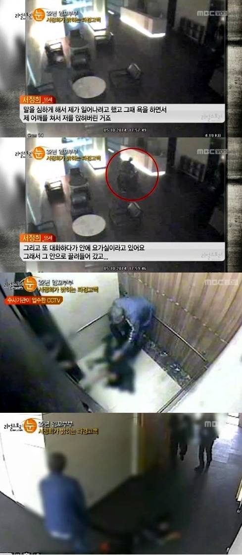 서세원 서정희 부부의 폭행사건이 고스란히 담긴 CCTV가 공개돼 충격을 주고 있다.24일 방송된 MBC '리얼스토리 눈'에서는 32년 만에 파경 위기에 놓인 연예계 대표 잉꼬부부 서세원 서정희 부부의 숨겨진 이야기가 전파를 탔다.'리얼스토리 눈'은 폭행 사건 이후 딸이 살고 있는 미국으로 떠나버린 서정희를 직접 만나 파경 심경을 방송 최초로 전했다.이날 서정희는 자신은 물론 자녀들까지 남편에게 언어 폭행을 당해왔으며, 독재자로 군림하는 남편으로부터 사회 활동을 하지 못하도록 억압 받아 왔다고 밝혔다.특히, 지난 5월 10일 청담동의 한 오피스탈 지하주차장에서 서정희를 폭행한 사건 당시의 CCTV 영상이 공개돼 이목을 끌었다.CCTV를 확인한 결과 서정희와 서세원은 지하 주차장 라운지에서 대화를 나누다 CCTV의 사각지대인 요가실로 이동했고, 이후 두 사람은 복도에서 몸싸움을 벌였다.이때 서세원은 건장한 남자들과 함께 서정희의 한쪽 다리를 잡은 채 엘리베이터를 향해 질질 끌고 갔다. 아무런 반항도 하지 못하고 누운 채로 끌려가는 서정희의 모습이 보는 이들을 경악케 했다.['리얼스토리 눈' 서세원 서정희 폭행 CCTV 공개, 사진=MBC '리얼스토리 눈' 방송 캡처]
